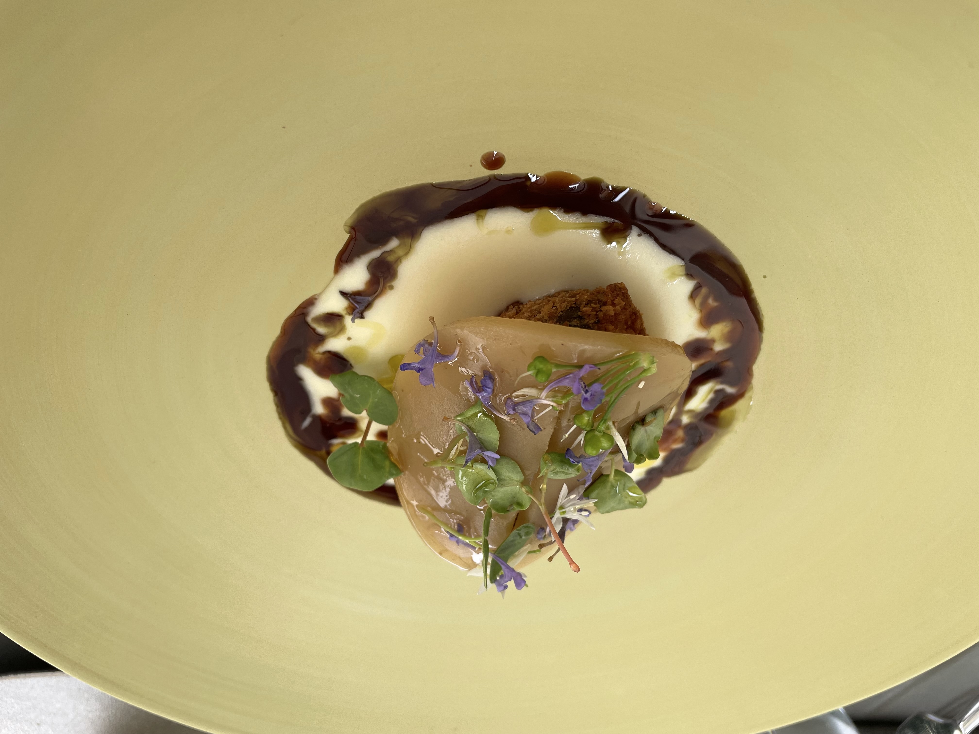 Tartin con fegato di maiale, ciliegia marasca e petali di aglio orsino